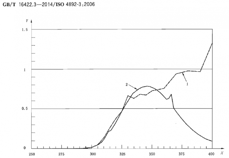 1B 型(UVA-351)熒光紫外燈:這種燈在300nm下的輻射低于總光能輸出的2%,在353nm有發(fā)射峰,用來(lái)模擬經(jīng)窗玻璃后日光的紫外部分,這種燈通常被稱(chēng)秋UVA-351(見(jiàn)表2)。附錄A中的圖A.2為250nm~400nm下典型的1B型(UVA-351)熒光燈對(duì)比經(jīng)窗玻璃過(guò)濾后日光的光譜輻照度圖。2型(UVB-313)燈可在相關(guān)方協(xié)商同意下使用,但協(xié)商意見(jiàn)應(yīng)在試驗(yàn)報(bào)告中指出。